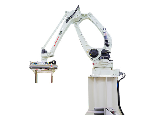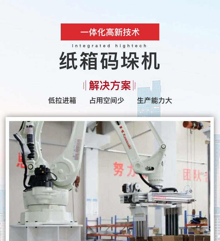 介紹:頂升抓取機構(gòu)帶有置中、疊包功能,可配合前疊包平衡碼垛效率;專業(yè)設計的紙板夾具帶有鉤,可夾取放置一層或兩層紙箱防掉落;機器人采用四軸式Kawasaki機械手臂兼顧性能與成本,將紙箱按自定義的垛型自動碼放到托盤上。 產(chǎn)品別稱:紙箱碼垛機械手、自動流水線紙箱碼垛機、紙箱碼垛、機器人紙箱碼垛、紙箱碼垛機器人